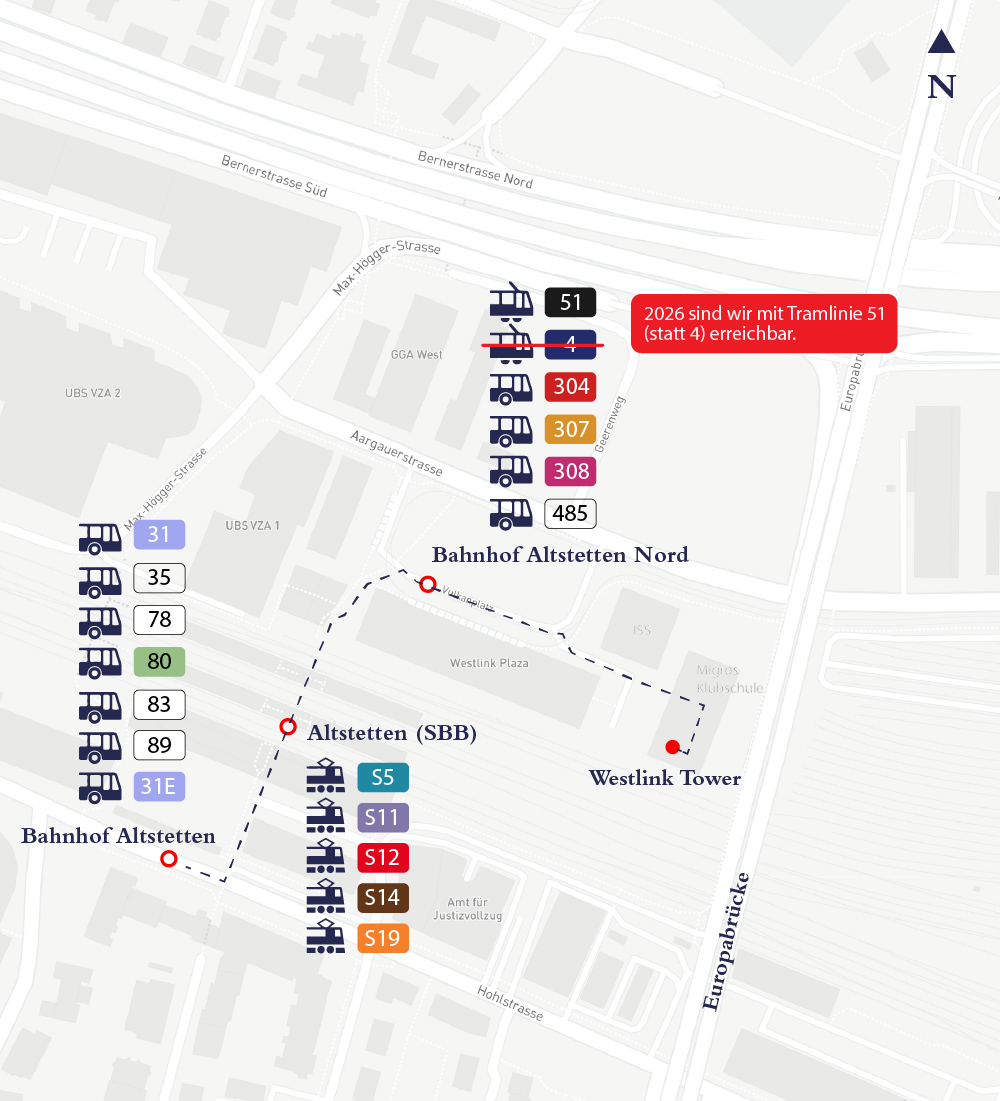 Das Zentrum für Gastroenterologie und Hepatologie befindet sich im 5. Stock (Lift) des Westlink Towers, direkt am Bahnhof Zürich Altstetten (Nord), oberhalb der Migros Klubschule. Es handelt sich um das Hochhaus direkt an der Europabrücke. Sie können sich die Wegleitung auch als PDF herunterladen und ausdrucken. PDF